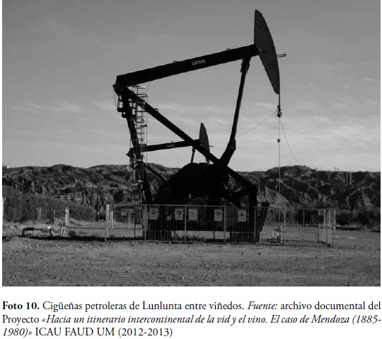 El descubrimiento de petróleo en la zona, en la segunda mitad del siglo XX, incorporó las cigüeñas extractoras de petróleo (Foto 10) al paisaje agrícola, entre los viñedos y plantaciones.