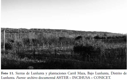 La estructura organizativa de la unidad de paisaje se divide en el Alto Lunlunta, con una morfología llana, y en el bajo Lunlunta, que colinda con el cauce del Río Mendoza, con morfología irregular adaptada a la sierra y al borde del río. La Sierra de Lunlunta es el elemento morfológico divisor y a la vez es central en la percepción y conformación del carácter de la unidad de paisaje12 (Foto 11).