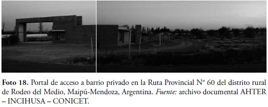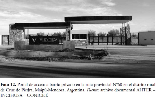 Al igual que en la unidad de paisaje anterior desde fines del siglo XX y fundamentalmente en lo que transcurre del siglo XXI se observa el parcelamiento de fincas destinadas al nuevo uso habitacional del barrio privado. En Lunlunta y Cruz de Piedra destacamos los ubicados en la ruta provincial 60 Carril Ozamis, y carril Maza y Franklin Villanueva (Foto 12). Otros elementos que afectan el carácter del paisaje son la presencia de tendido aéreos de servicios de luz, y teléfono, basurales espontáneos y tala de árboles en los caminos.