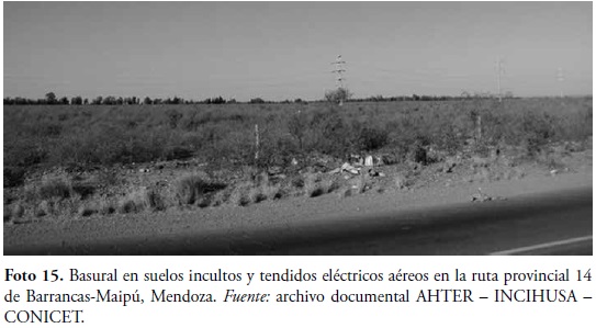 En la actualidad, el paisaje se encuentra amenazado por elementos que lo degradan, como tendidos aéreos de servicios de luz y teléfono y presencia de basurales espontáneos, específicamente sobre la ruta provincial 14 de Barrancas (Foto 15).