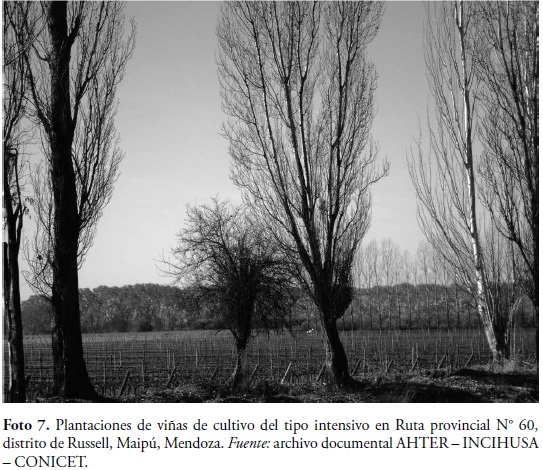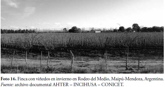 En este marco, la impronta formal en el paisaje rural actual, que se originó en la industrialización de la primera modernización de fines de siglo XIX y las primeras décadas del XX, se compuso en rasgos generales por elementos rectores y ordenadores del territorio, como las vías de circulación caminera y ferroviaria, los canales e hijuelas y los establecimientos industriales principalmente vitivinícolas con todas las edificaciones que lo integran (Foto 2).