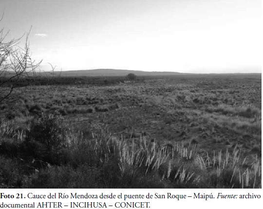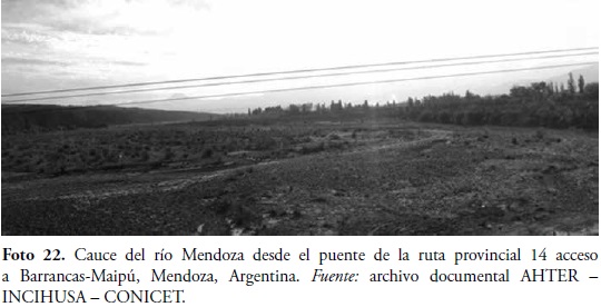 Su suelo hace unos años está comenzando a utilizarse como canteras de áridos. Las vías de circulación que lo atraviesan con puentes y vinculan las márgenes Norte con el Sur son las rutas provinciales Nos. 14, 60, 8, 50 y la ruta nacional N° 7. Los puentes son los puntos más importantes de visualización de la unidad de paisaje. El carácter identitario de la unidad de paisaje ha cambiado con el trancurso de los siglos: de ser uno de los ríos más caudalosos se transformó en parte de las tierras características de las zonas desérticas. Actualmente se comporta como una reserva ecológica natural para la flora y fauna del lugar (Foto 22).