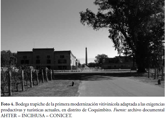 En la actualidad, continuando con la misma dinámica de adaptación a los cambios, algunas de las antiguas bodegas fueron restauradas y adaptadas a las nuevas exigencias productivas y del turismo enológico, propios de la segunda modernización vitivinícola que responden a las exigencias de una producción de vino de alta calidad de exportación y un turismo enológico internacional, como es el caso de Bodega Trapiche antigua Cavagnaro (foto 4) ubicada en el distrito de Coquimbito.