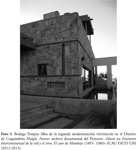 Pero también se construyeron nuevas bodegas en los antiguos terrenos de la primera modernización vitivinícola y se han introducido, tanto en su diseño funcional como formal, estilos contemporáneos que convierten la imagen en la marca del establecimiento y a su vez brindan servicios turísticos que responden a las exigencias de lujo internacional, caracterizado por la exaltación de los sentidos, el placer y recreación del turista, como es el caso de Bodega Tempus Alba en el distrito de Coquimbito (foto 5).