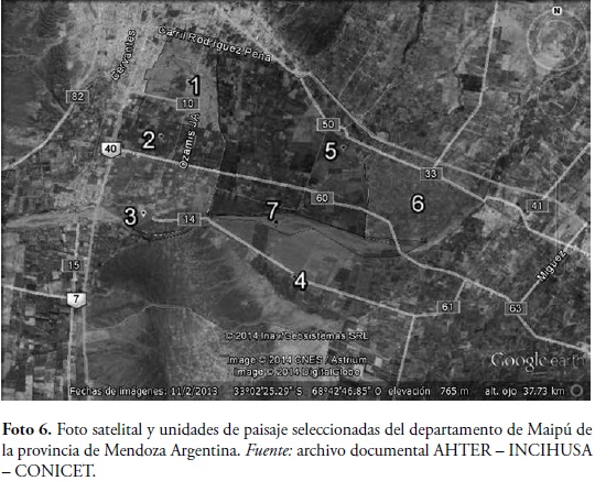 Por consiguiente, para detectar los elementos específicos que están afectando y transformando el carácter del paisaje rural de Maipú, es pertinente, además de comprender la estructuración histórica del territorio departamental y sus hitos, ya mencionados, identificar y caracterizar las unidades de paisaje que lo integran, ya que su análisis nos permite acercarnos al problema a una escala menor en el territorio, con sus características paisajísticas y elementos de degradación específicos.