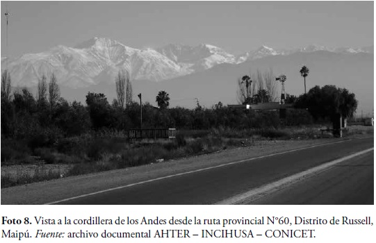 Otro componente del paisaje que conforma su carácter son las bodegas y casas patronales. En su territorio se encuentran testimonios materiales de mediados del siglo XIX hasta mediados del siglo XX. Los viñedos, plantados en parcelas geométricas, son del tipo intensivo. Junto a las plantaciones de olivares, estos conforman una red de relaciones con los establecimientos productivos y los poblados urbanos, y juntos integran la principal identidad del lugar (Foto 8).