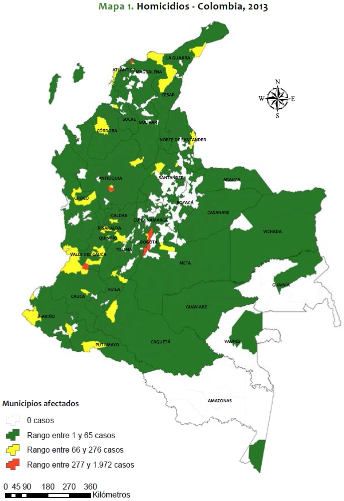 UNODC (2013). Estudio mundial sobre el homicidio, 2013. Consultado en https://www.unodc.org/documents/gsh/pdfs/GLOBAL_HOMICIDE_Report_ExSum_spanish.pdf [ Links ]jpg" target="_blank">Mapa 1. Homicidios - Colombia, 2013