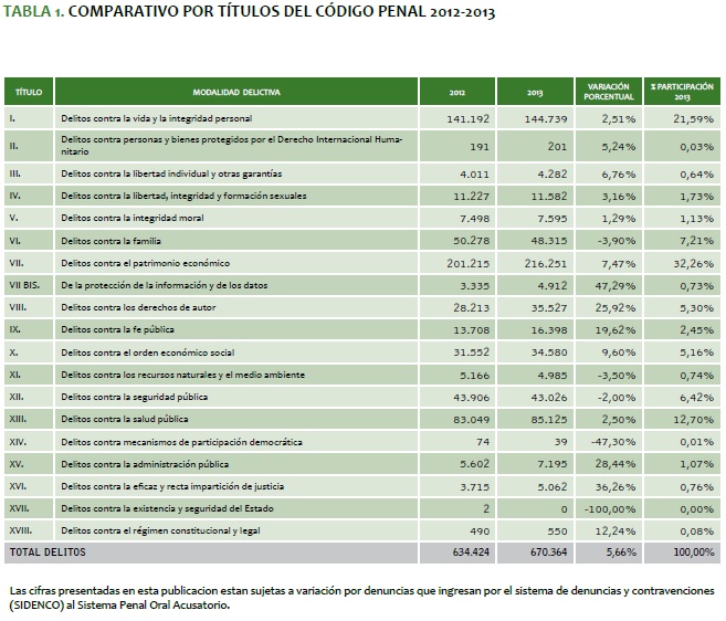 Cuatro títulos del Código Penal abarcan el 77,93 % del total de la criminalidad registrada durante el 2013; estos son: delitos "contra el patrimonio económico" (34,09 %), "contra la vida y la integridad personal" (22,81 %), "contra la salud pública" (13,42 %) y "contra la familia" (7,62 %).