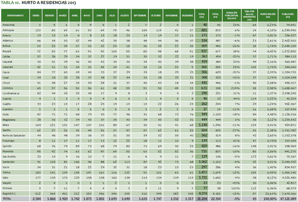 TABLA 10. HURTO A RESIDENCIAS 2013