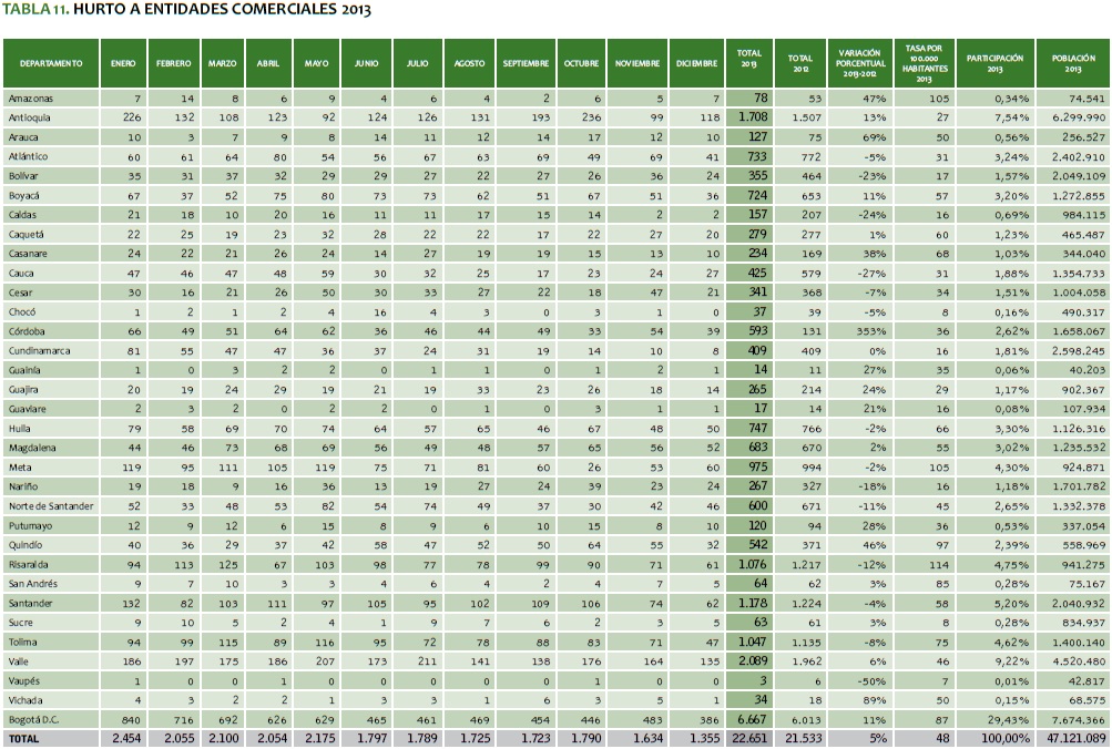 TABLA 11. HURTO A ENTIDADES COMERCIALES 2013