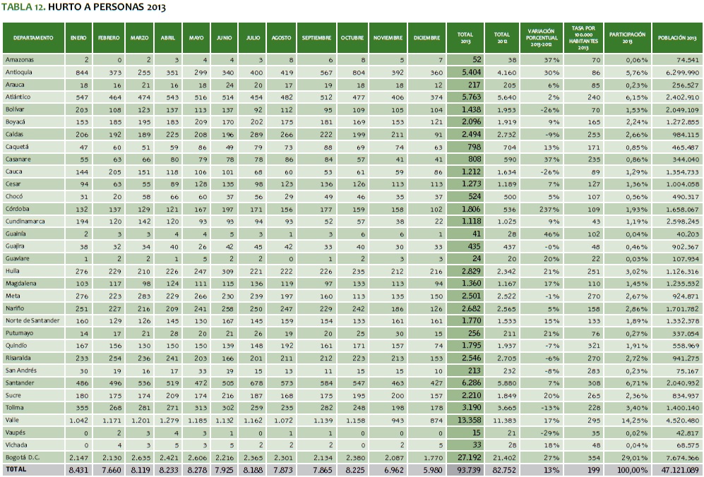 TABLA 12. HURTO A PERSONAS 2013