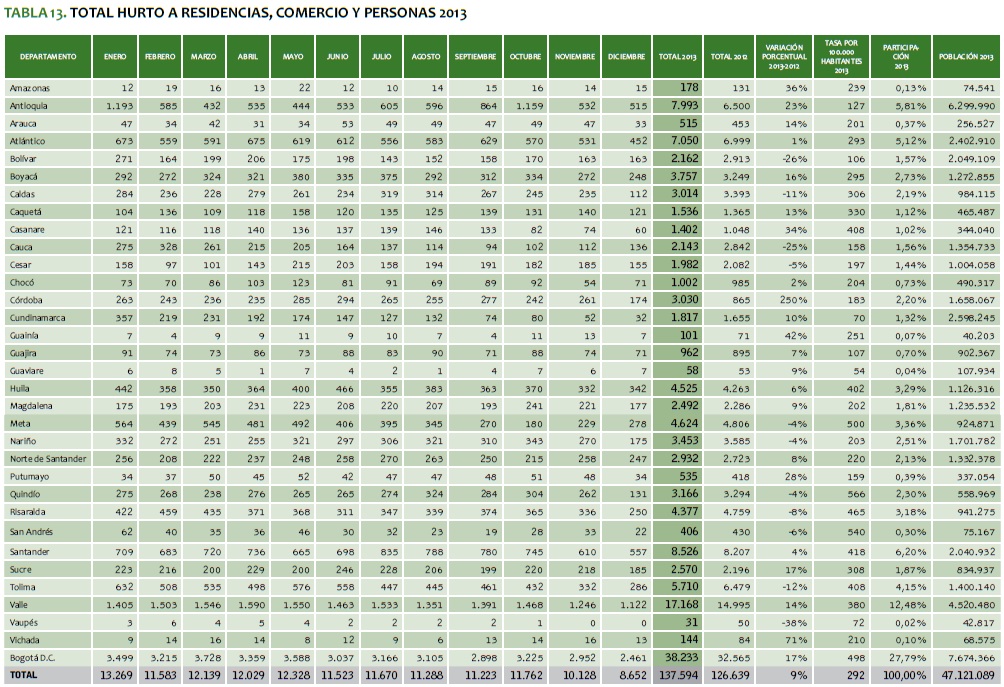 TABLA 13. TOTAL HURTO A RESIDENCIAS, COMERCIO Y PERSONAS 2013