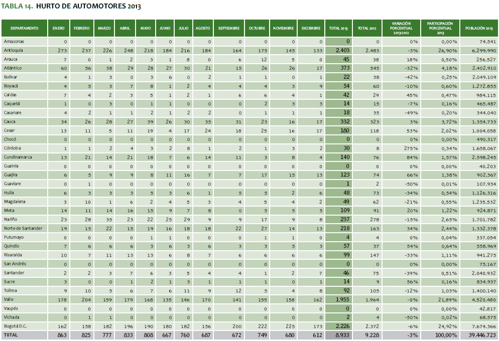 TABLA 14. HURTO DE AUTOMOTORES 2013