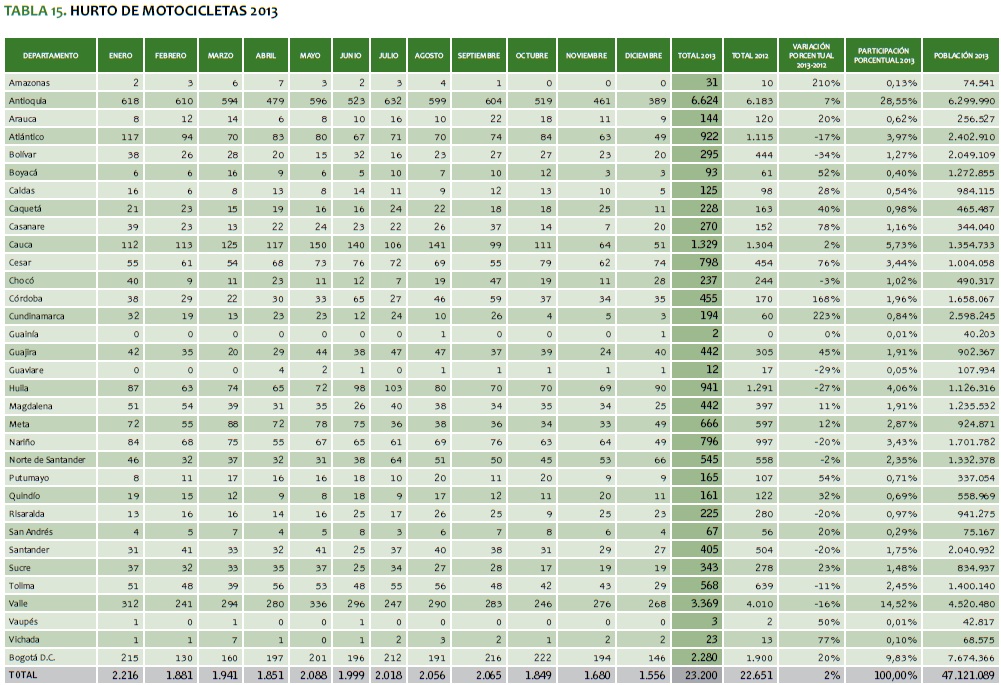 En el 2012 se hurtaron un total de 31.879 vehículos (22.651 motocicletas y 9.228 automotores), lo que ocasionó una variación ascendente del 1 %, reflejada en 2.678 vehículos más que en el 2013.