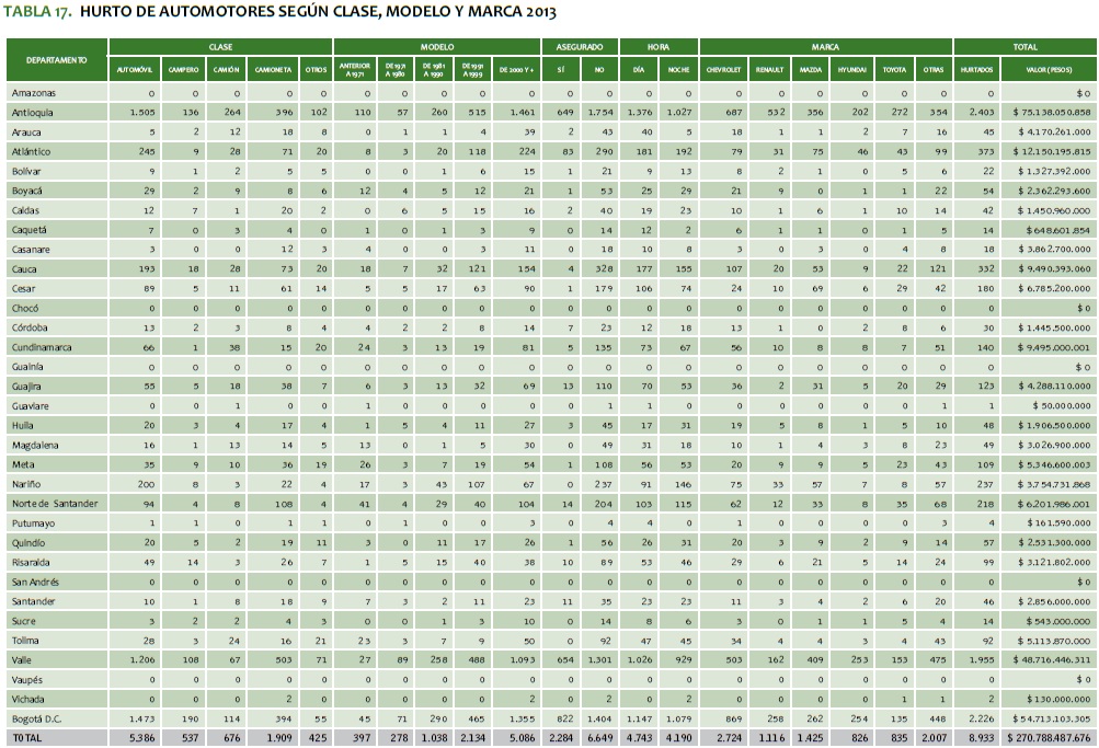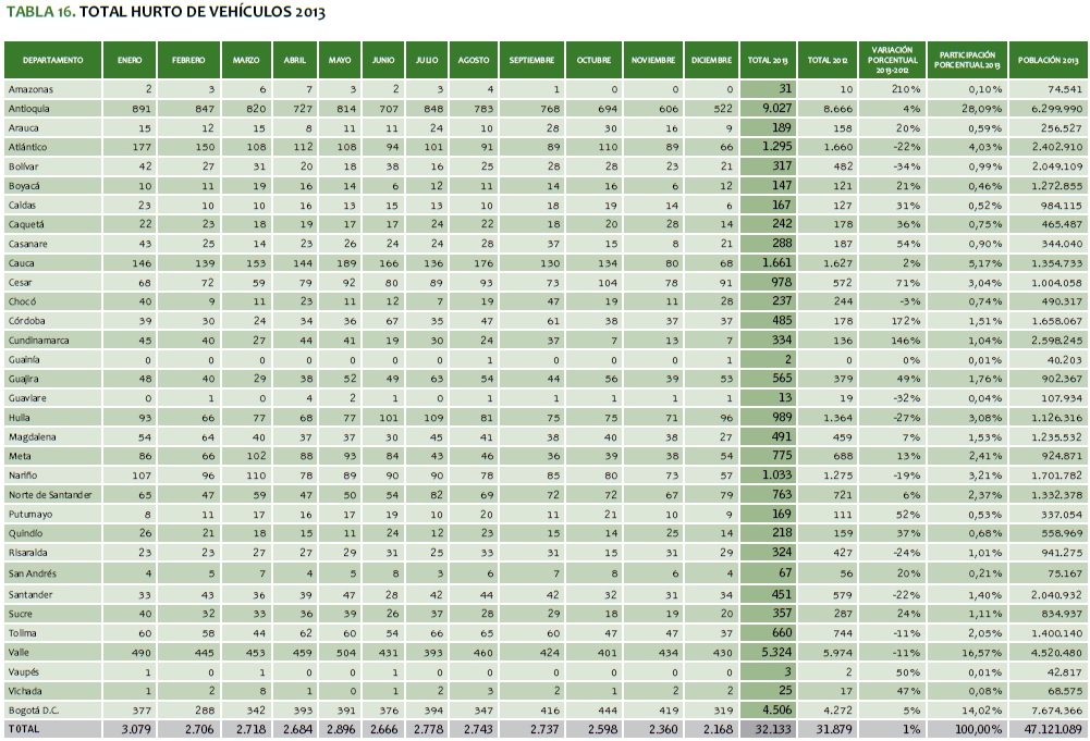 En el 2013 el hurto de vehículos (automotores y motocicletas) registró 32.133 hechos; es decir, un incremento del 1 % (254 casos más), en comparación con el 2012 (31.879); lo anterior significa que en el Colombia, para el 2013, se hurtaron en promedio diario 88 vehículos (vid. tabla 16).
