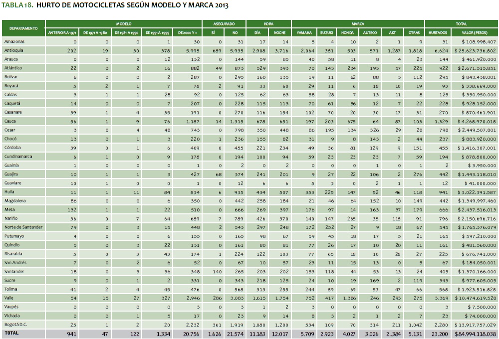 TABLA 18. HURTO DE MOTOCICLETAS SEGúN MODELO Y MARCA 2013