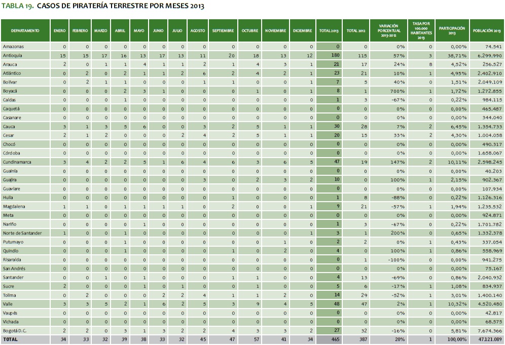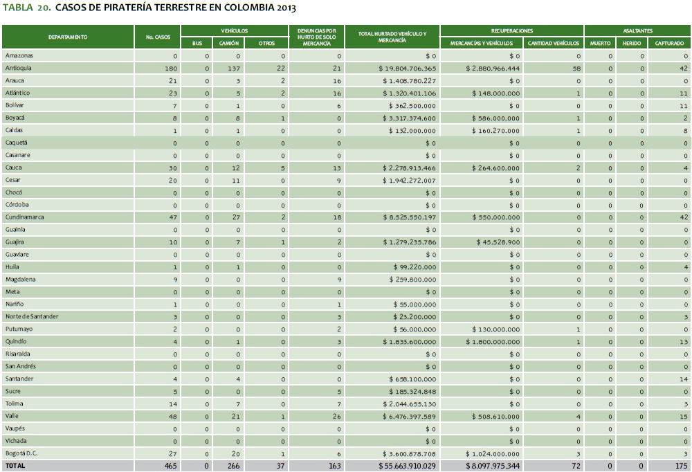TABLA 20. CASOS DE PIRATERíA TERRESTRE EN COLOMBIA 2013