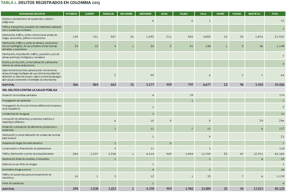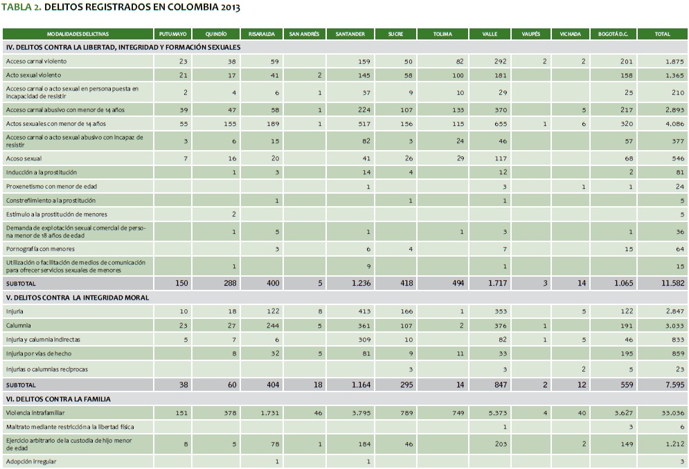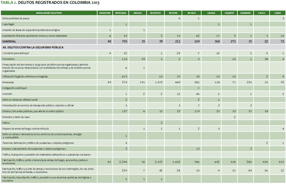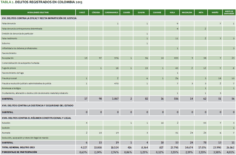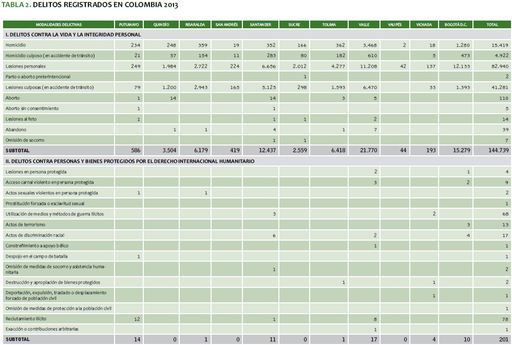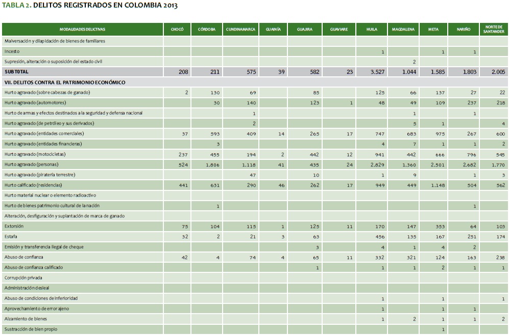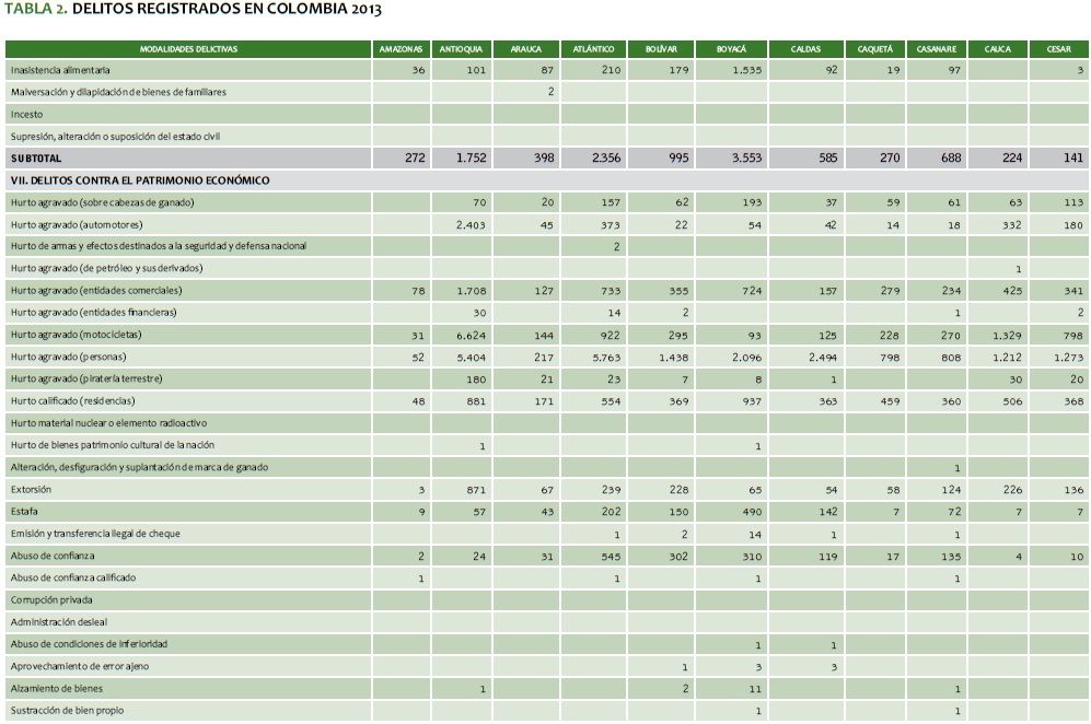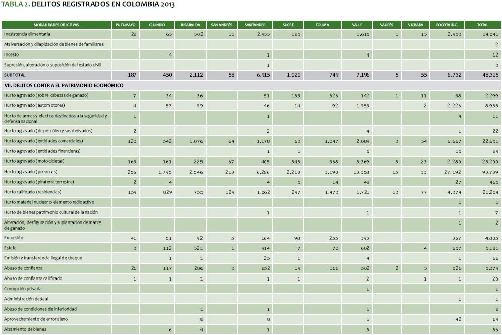 TABLA 2. DELITOS REGISTRADOS EN COLOMBIA 2013