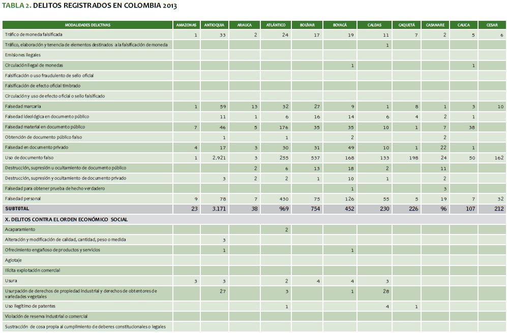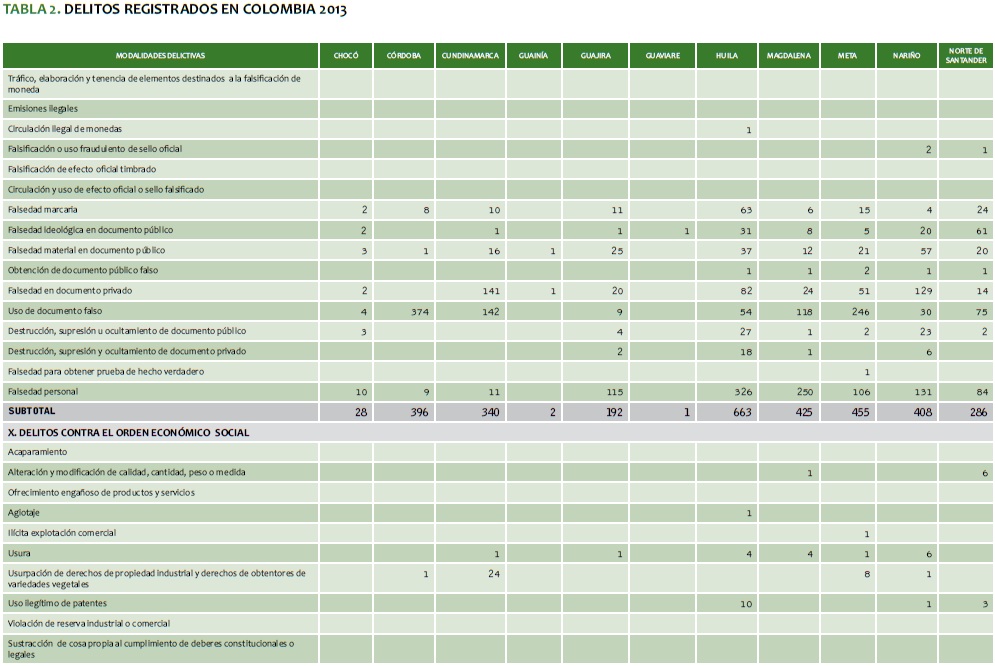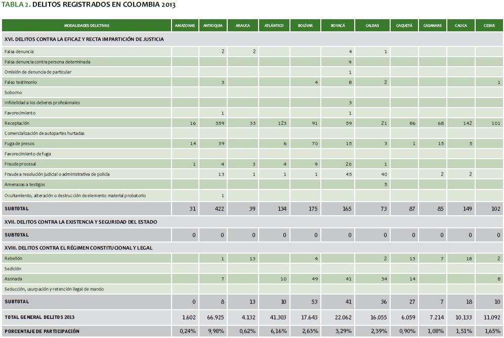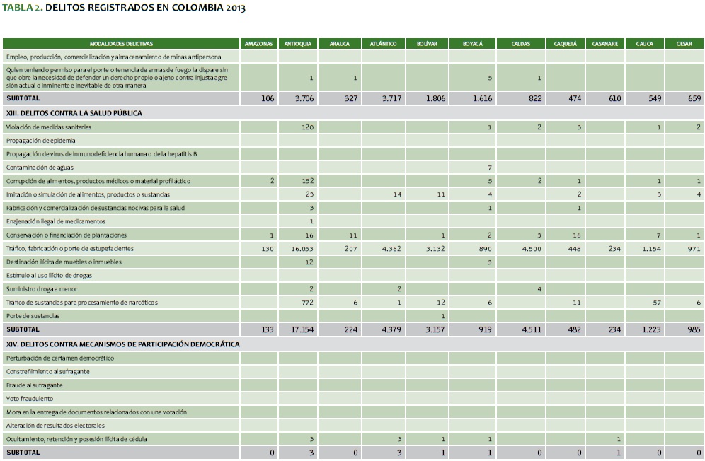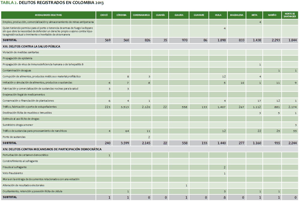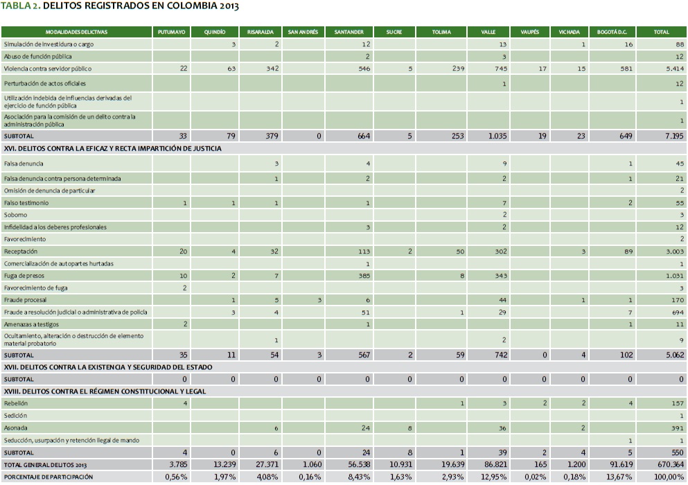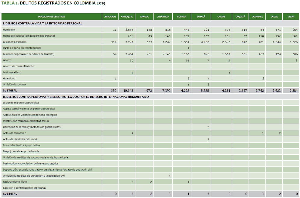 TABLA 2. DELITOS REGISTRADOS EN COLOMBIA 2013