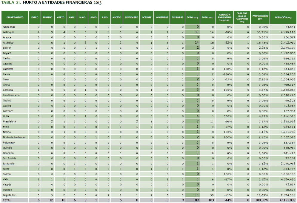 TABLA 21. HURTO A ENTIDADES FINANCIERAS 2013
