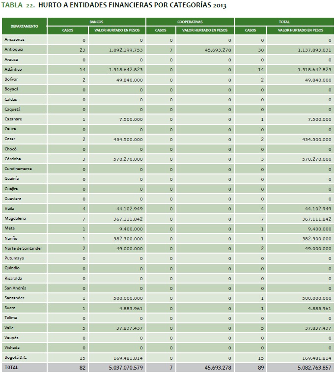TABLA 22. HURTO A ENTIDADES FINANCIERAS POR CATEGORíAS 2013