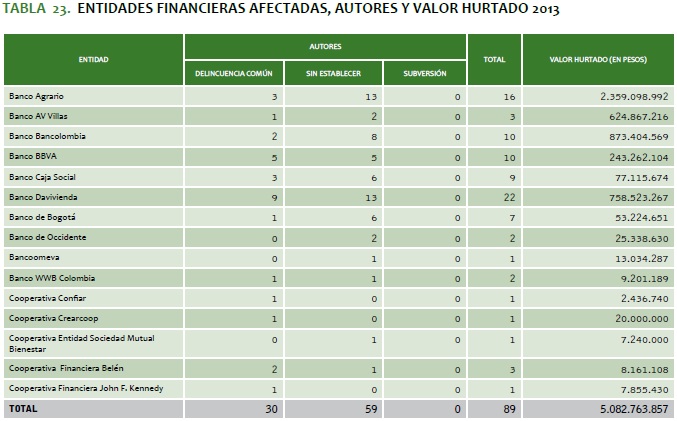 Las entidades más afectadas en el 2013 por este tipo de conductas fueron el Banco Davivienda, con el 25 % (22 casos); el Banco Agrario, con el 18 % (16), seguido de Bancolombia y BBVA, con el 11 %, respectivamente (10 hechos cada uno) (vid. tabla 23).