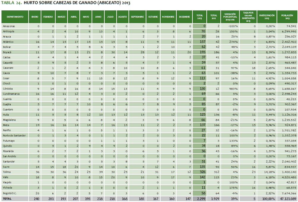 TABLA 24. HURTO SOBRE CABEZAS DE GANADO (ABIGEATO) 2013