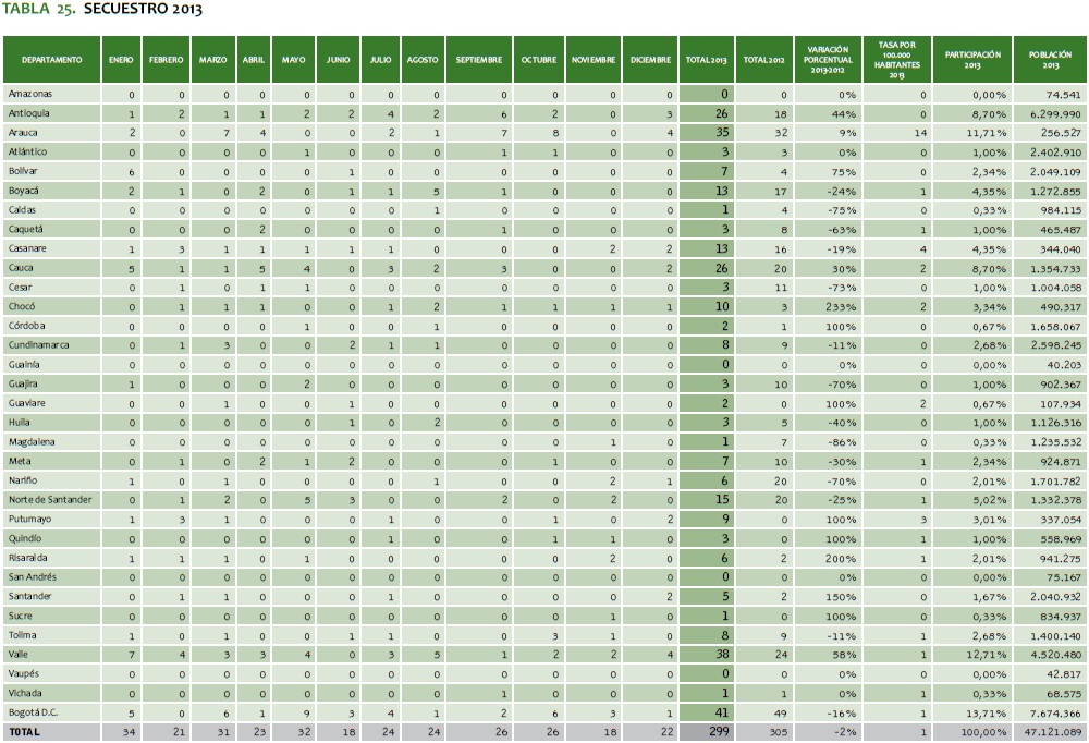 TABLA 25. SECUESTRO 2013