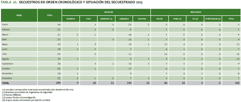 TABLA 26. SECUESTROS EN ORDEN CRONOLóGICO Y SITUACIóN DEL SECUESTRADO 2013