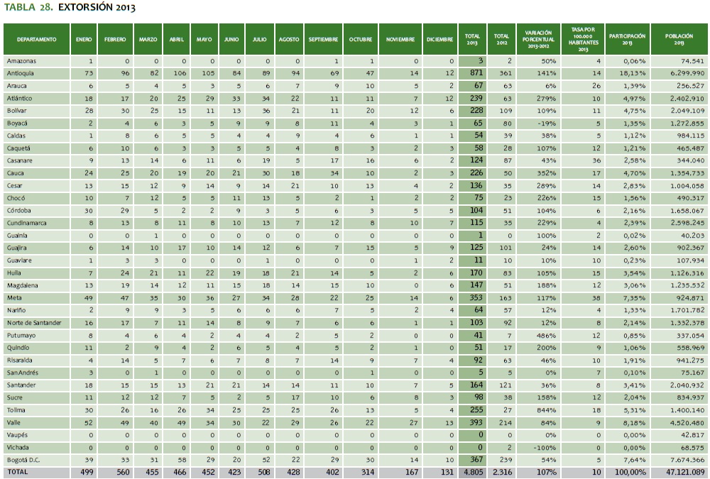 TABLA 28. EXTORSIóN 2013