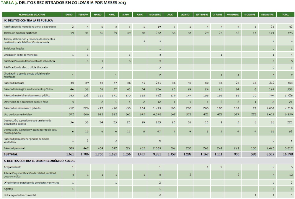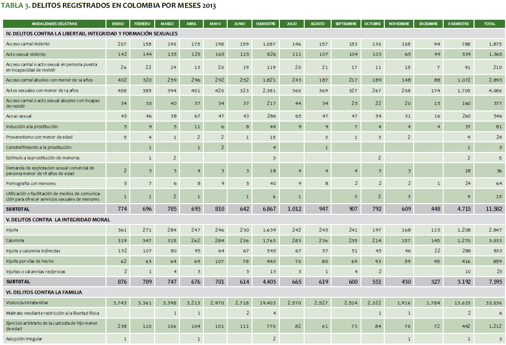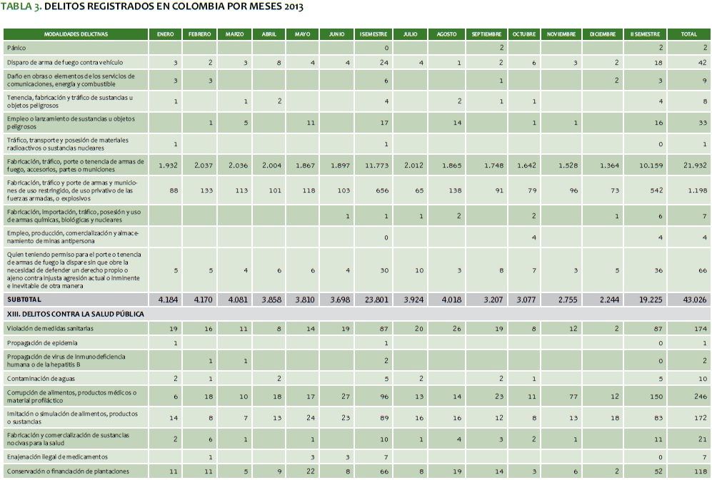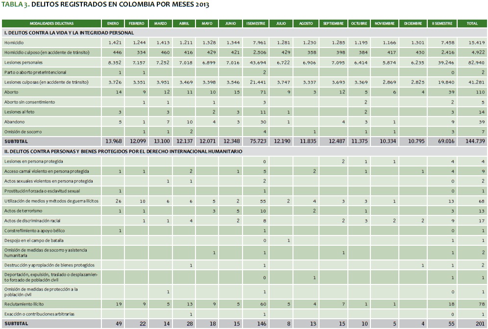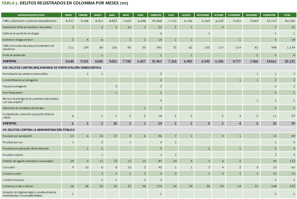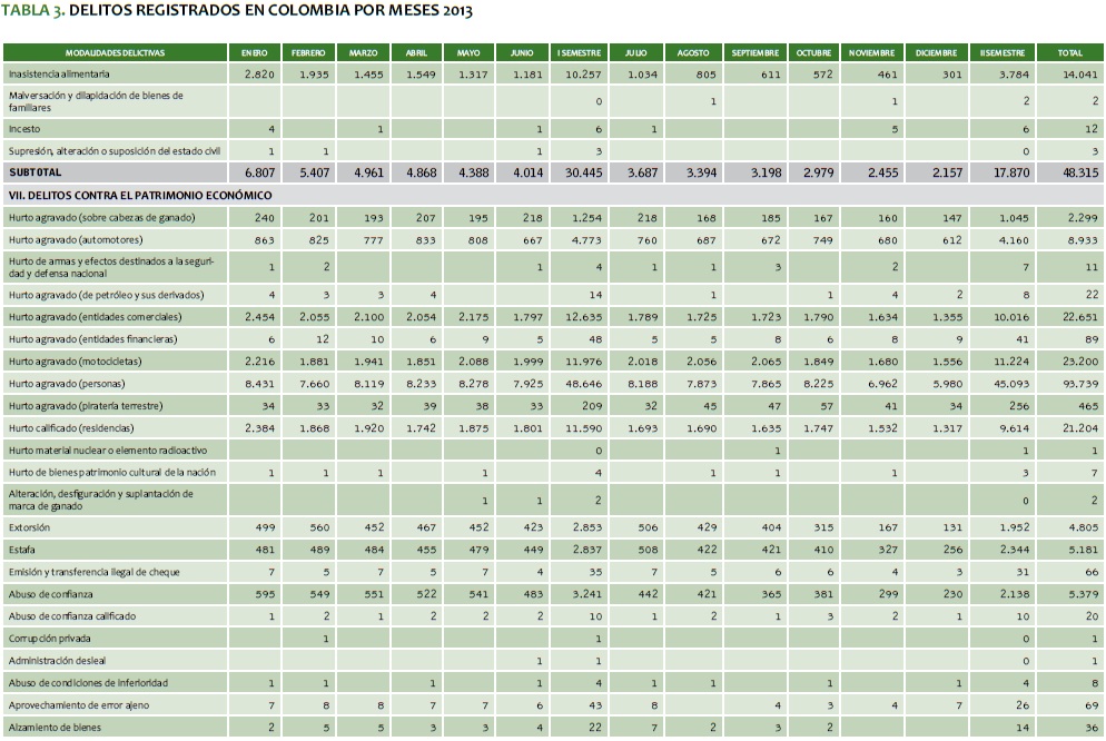 TABLA 3. DELITOS REGISTRADOS EN COLOMBIA POR MESES 2013