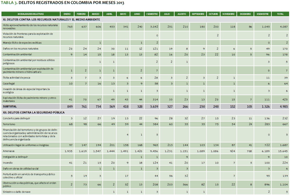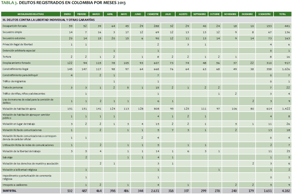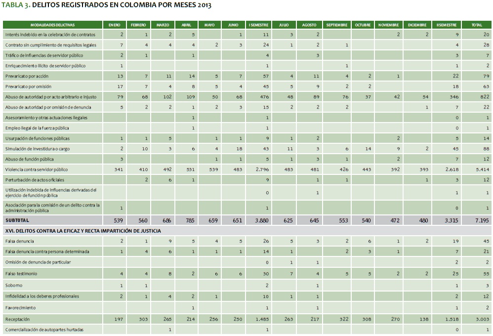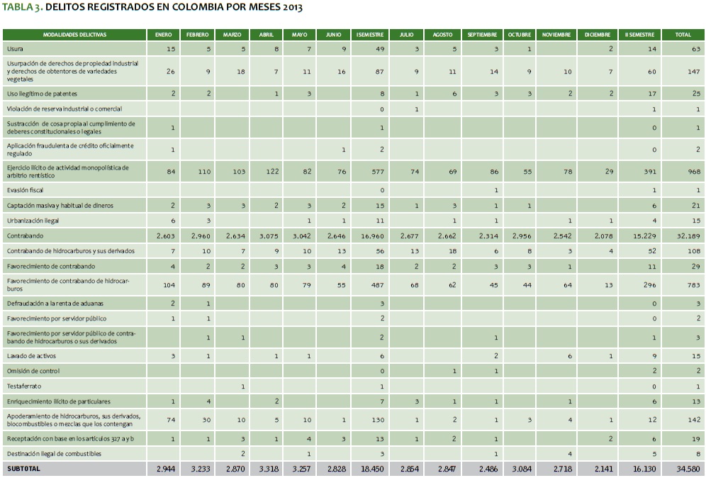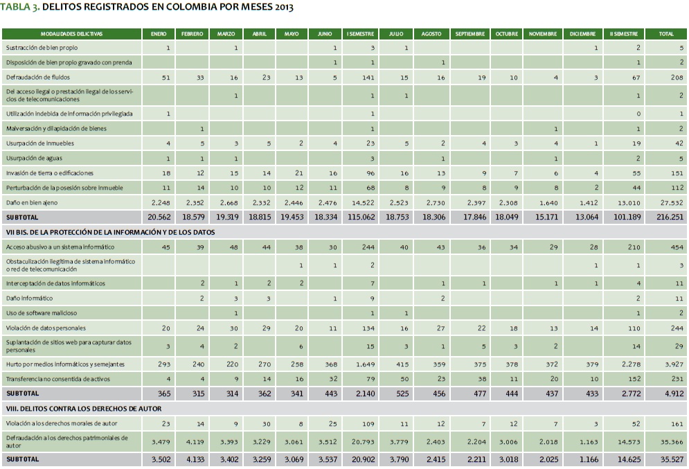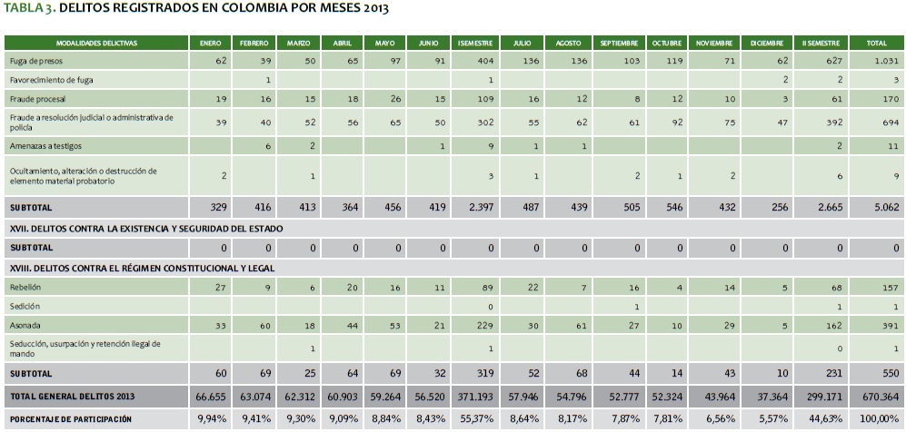 TABLA 3. DELITOS REGISTRADOS EN COLOMBIA POR MESES 2013