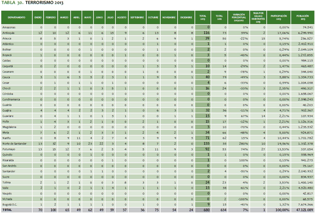 TABLA 30. TERRORISMO 2013