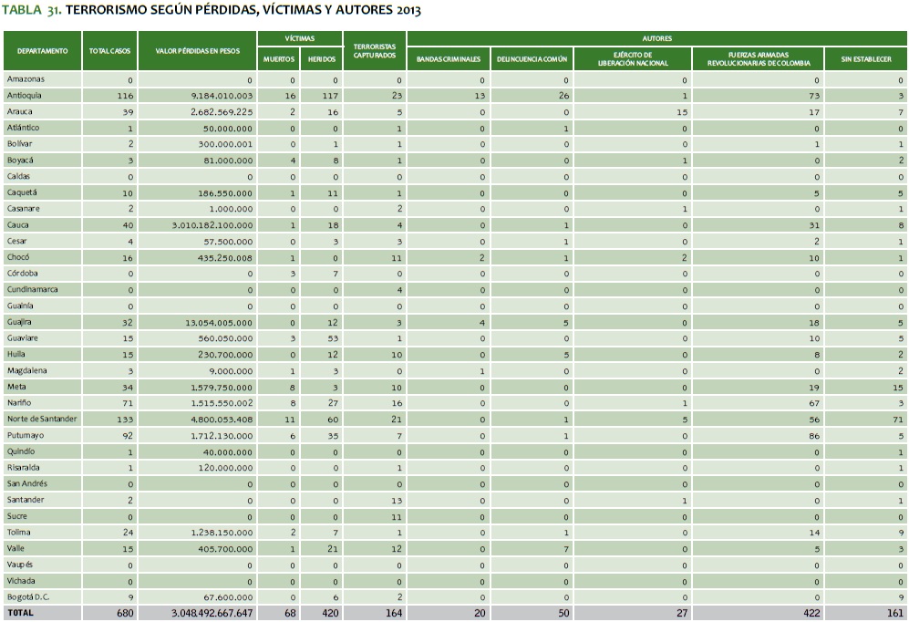 TABLA 31. TERRORISMO SEGúN PéRDIDAS, VíCTIMAS Y AUTORES 2013