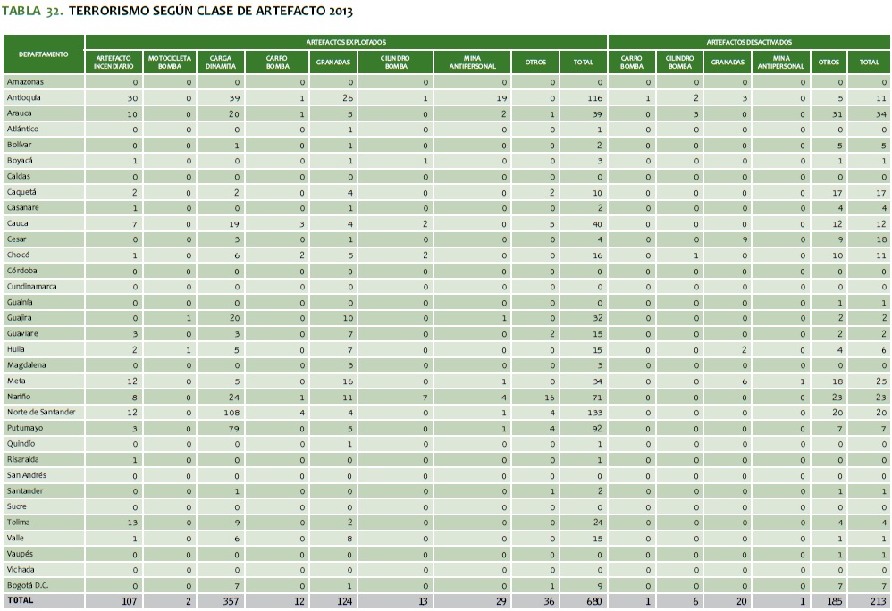 TABLA 32. TERRORISMO SEGúN CLASE DE ARTEFACTO 2013