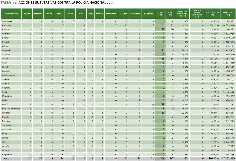 TABLA 33. ACCIONES SUBVERSIVAS CONTRA LA POLICíA NACIONAL 2013