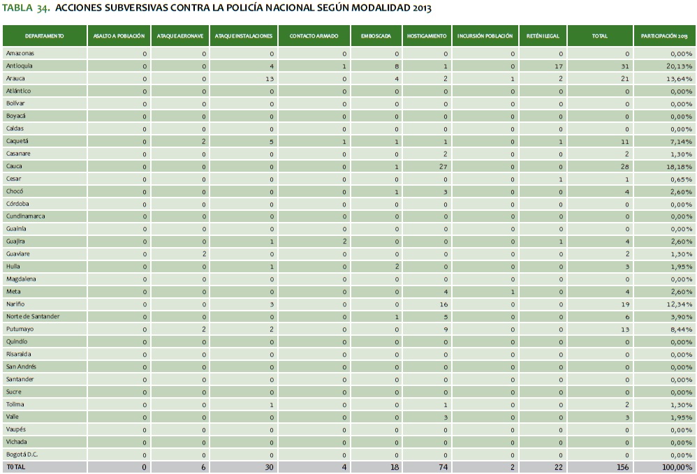TABLA 34. ACCIONES SUBVERSIVAS CONTRA LA POLICíA NACIONAL SEGúN MODALIDAD 2013