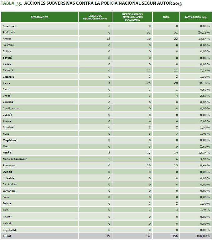 TABLA 35. ACCIONES SUBVERSIVAS CONTRA LA POLICíA NACIONAL SEGúN AUTOR 2013