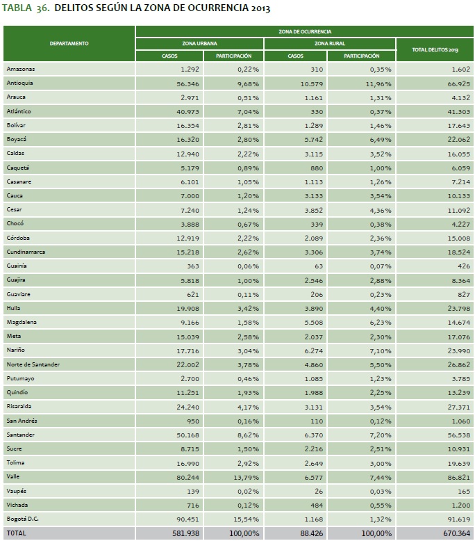 TABLA 36. DELITOS SEGúN LA ZONA DE OCURRENCIA 2013