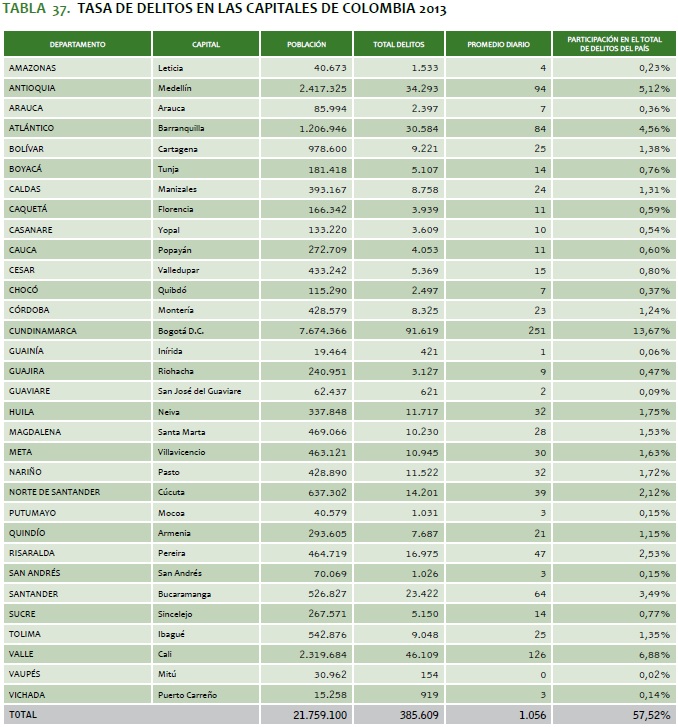 TABLA 37. TASA DE DELITOS EN LAS CAPITALES DE COLOMBIA 2013