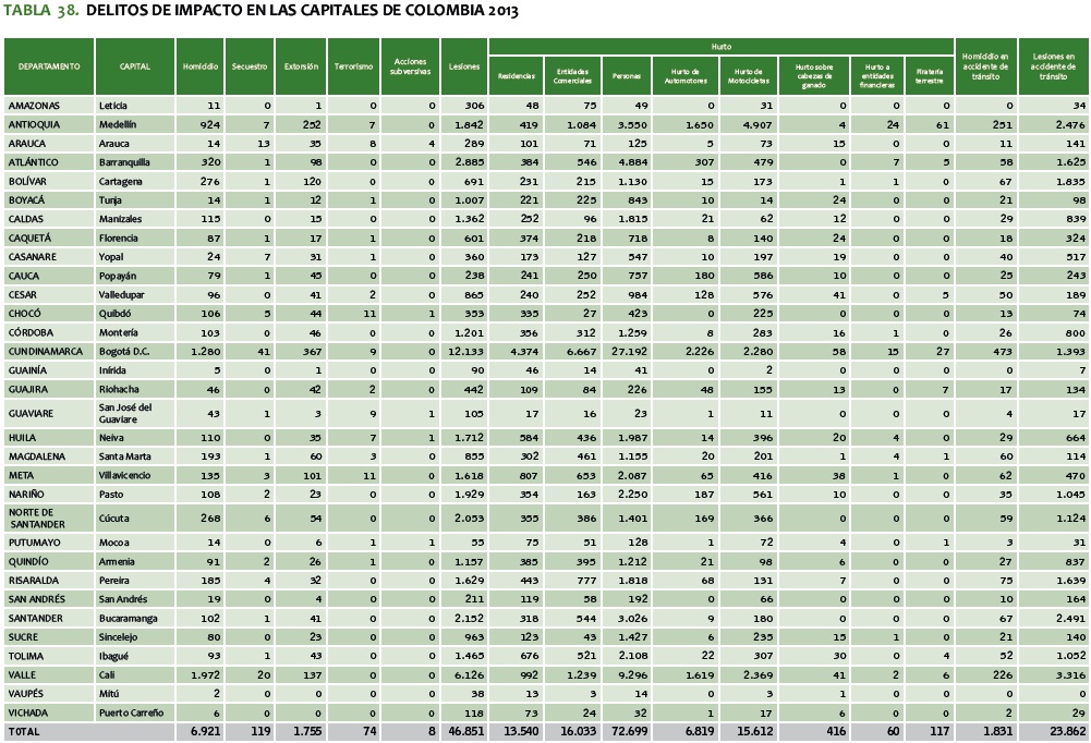 TABLA 38. DELITOS DE IMPACTO EN LAS CAPITALES DE COLOMBIA 2013