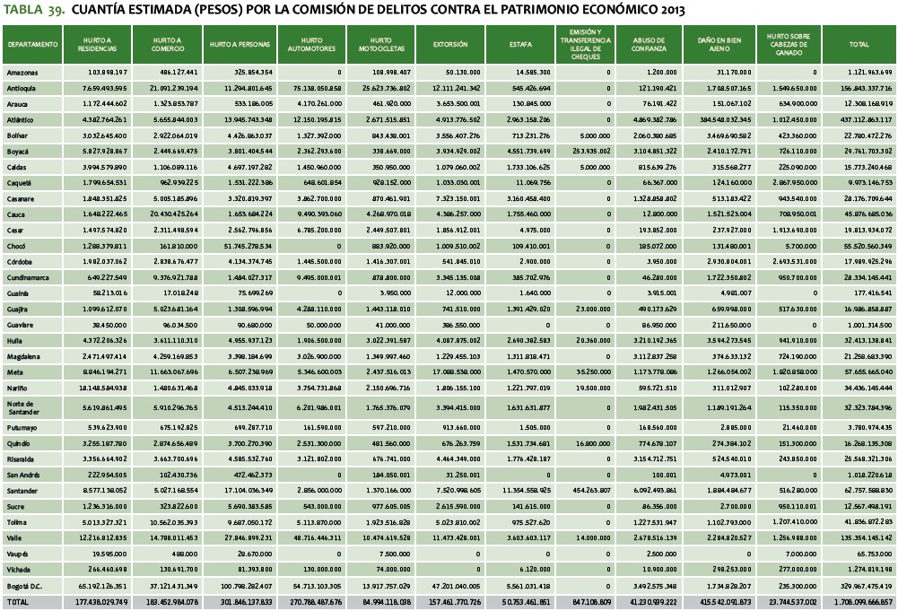 En el 2013, el valor estimado de los bienes hurtados en estas conductas fue de aproximadamente 662.737 millones de pesos (vid. tabla 39).
