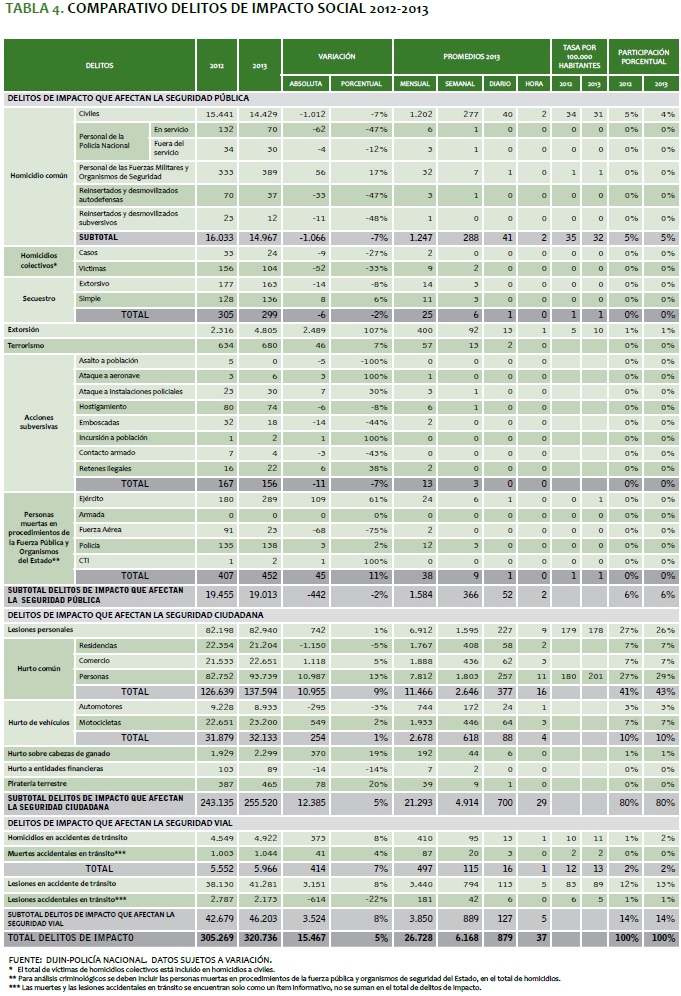 En este sentido, el artículo presenta las estadísticas policiales registradas en el Sistema de Información Estadística, Delincuencial, Contravencional y Operativa de la Policía Nacional (SIEDCO), sobre las conductas tipificadas en la ley penal, que reflejan las denuncias ciudadanas, así como los hechos que han sido motivos de policía, que se suscitaron en los años comparativos 2012 y 2013.