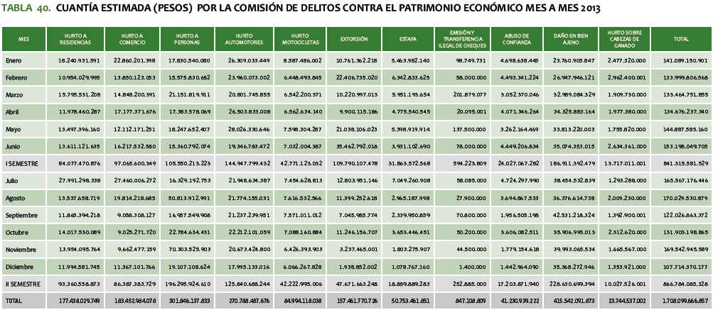 TABLA 40. CUANTíA ESTIMADA (PESOS) POR LA COMISIóN DE DELITOS CONTRA EL PATRIMONIO ECONóMICO MES A MES 2013