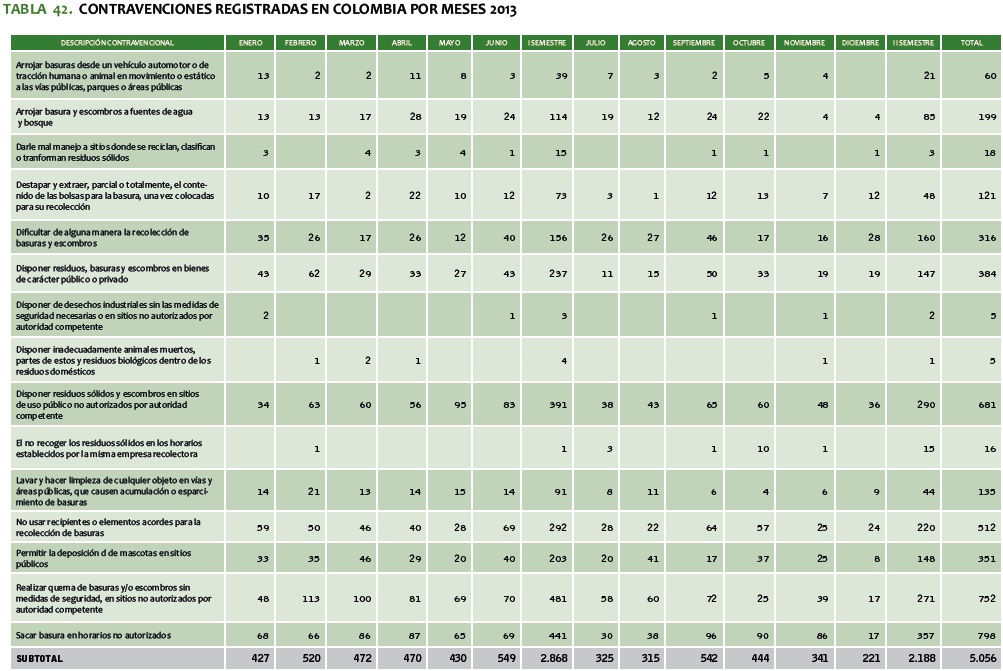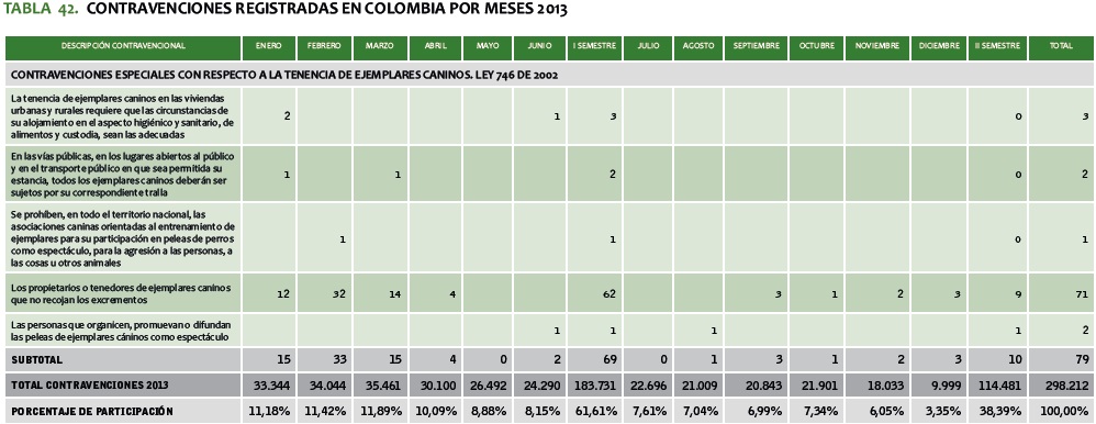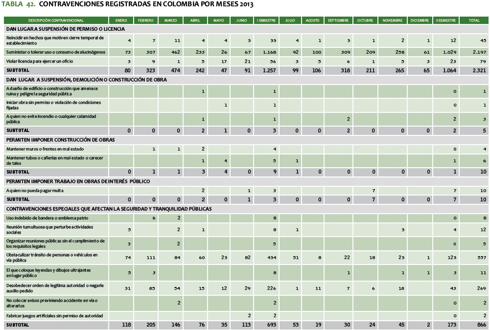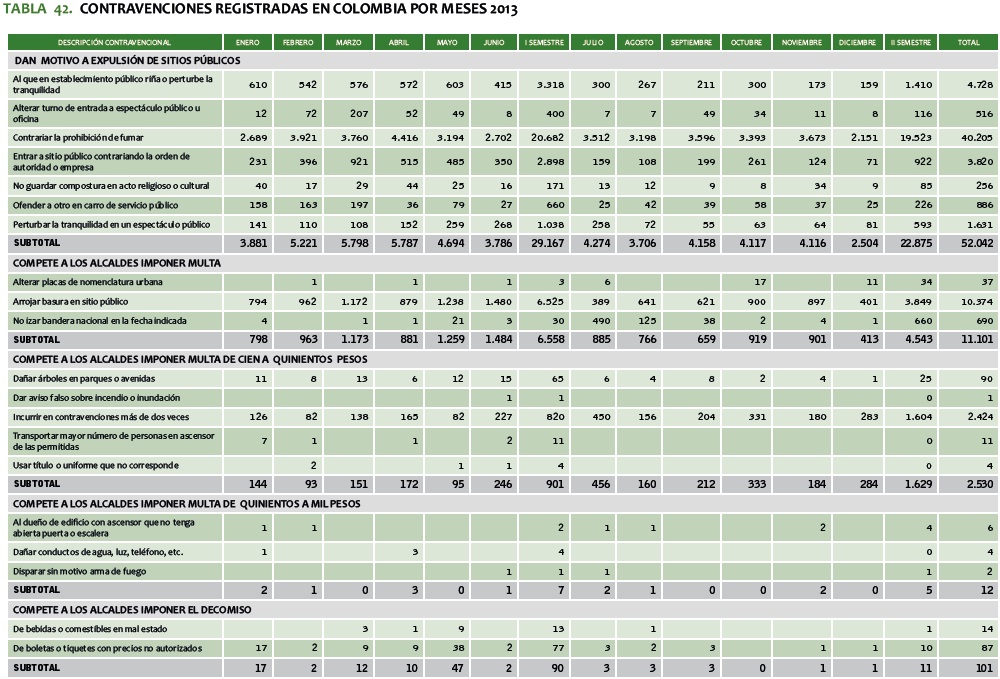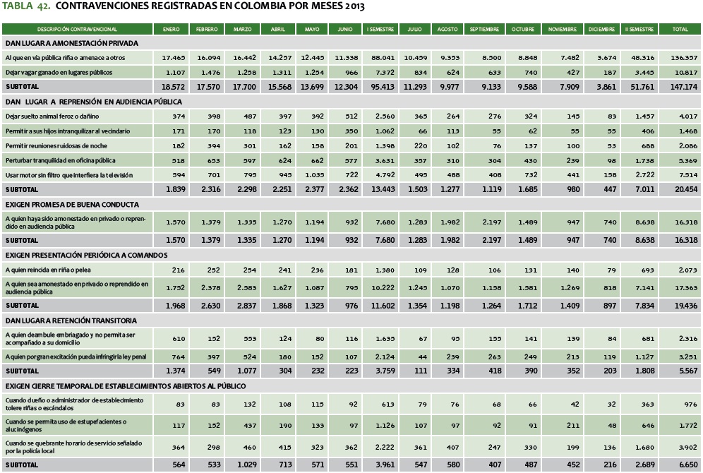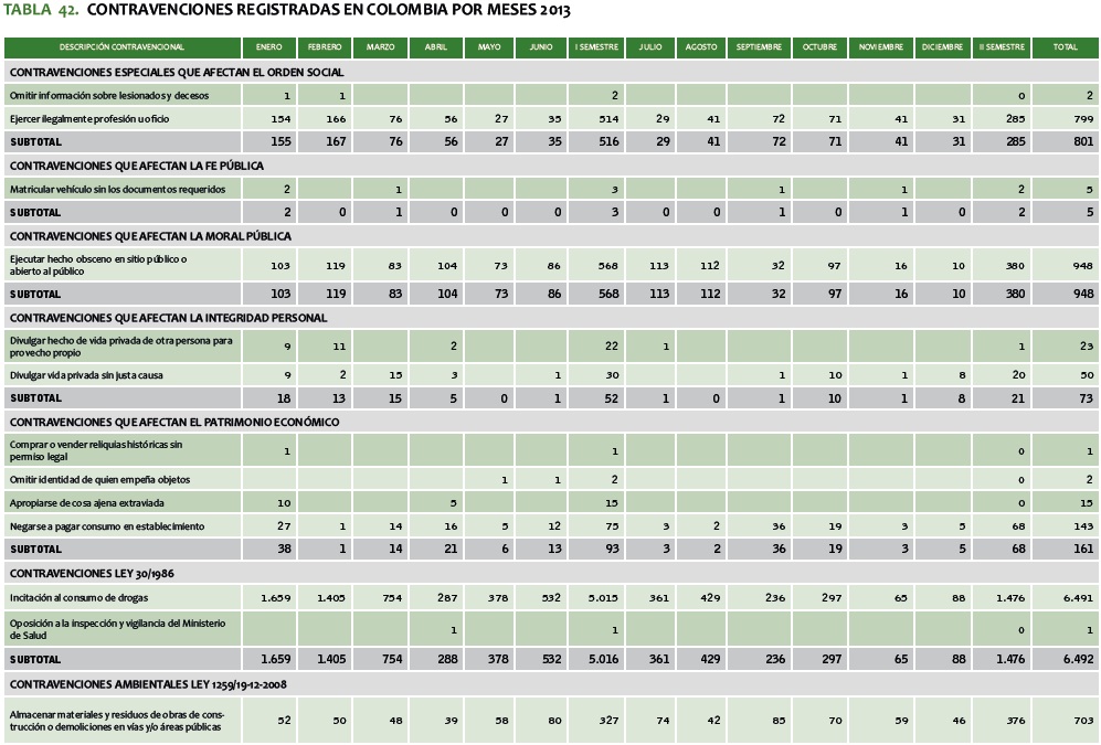 TABLA 42. CONTRAVENCIONES REGISTRADAS EN COLOMBIA POR MESES 2013