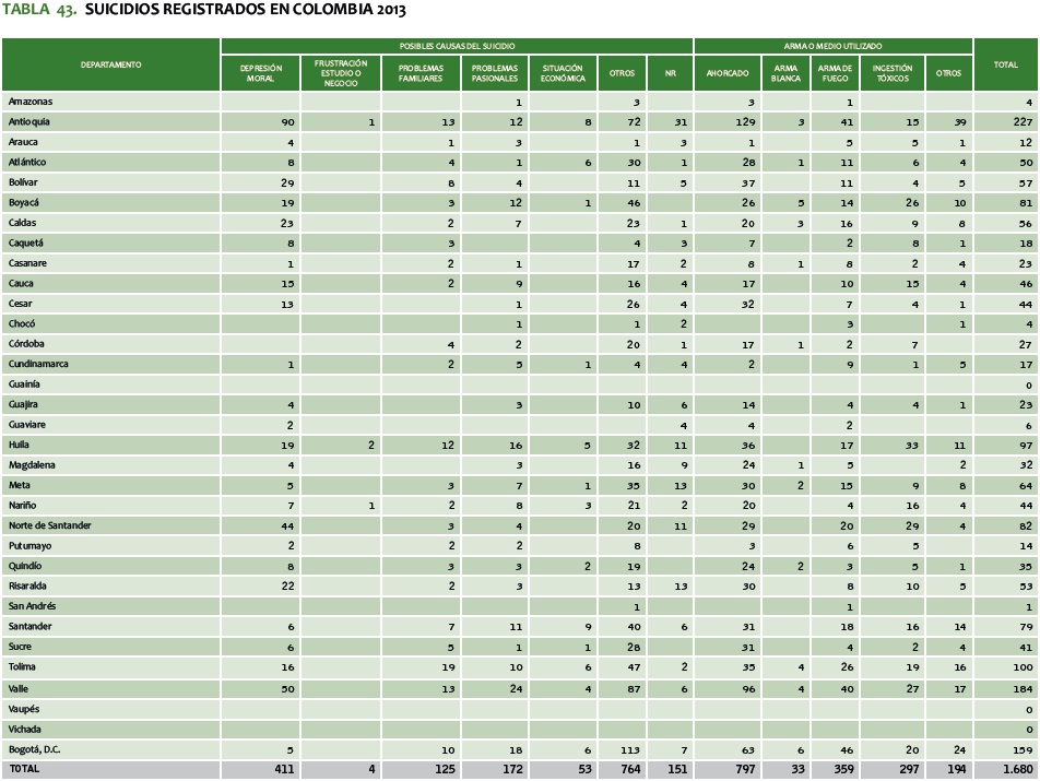 TABLA 43. SUICIDIOS REGISTRADOS EN COLOMBIA 2013TABLA 43. SUICIDIOS REGISTRADOS EN COLOMBIA 2013