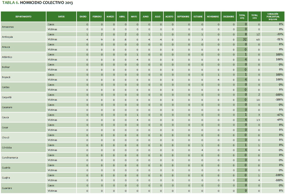TABLA 6. HOMICIDIO COLECTIVO 2013