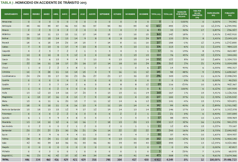 TABLA 7. HOMICIDIO EN ACCIDENTE DE TRáNSITO 2013