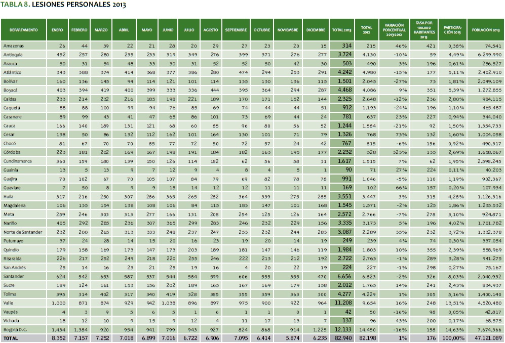TABLA 8. LESIONES PERSONALES 2013