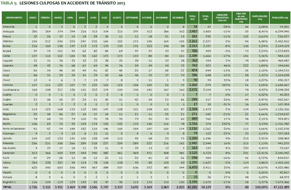 TABLA 9. LESIONES CULPOSAS EN ACCIDENTE DE TRáNSITO 2013